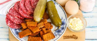 Сытный вариант широко известной закуски. Более высокой калорийности салат обязан наличием в составе крахмала. Чтобы ускорить процесс приготовления, продукты подготавливают заранее: в одной кастрюле отваривают овощные составляющие, в другой – яйца.