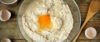 3. Add salt to the sifted flour, pour in a glass of boiling water and quickly stir until smooth. Add the egg-butter mixture and knead the dough. Cover the workpiece with a towel and leave on the table for 30 minutes.